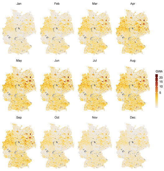Understanding the power provision impact of existing PV systems on a highly resolved spatiotemporal scale is a prerequisite for successful integration of future variable renewables into regional power grids and associated electricity markets. As a first utilization example on this topic, Figure 5 shows the monthly power generation from PV systems at the spatial resolution of LAU2, based on the presented simulation results. In this way, regional advances of the energy transition towards higher shares of photovoltaics can be reliably monitored with the help of spatiotemporal distributions of the power production.
