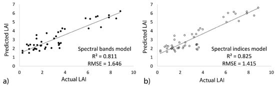 Two GRP models for LAI prediction were built, considering the original ten spectral bands and the full set of spectral indices (Table 1). The accuracy of the spectral indices model was slightly better (R2 = 0.825 RMSE = 1.415) than that of the spectral bands model (R2 = 0.811 RMSE = 1.646) (Figure 2).