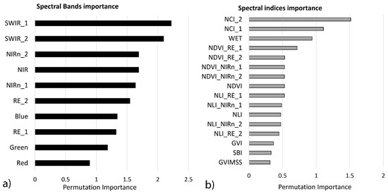 The most important predictor variables in rank order, using the permutation importance of (a) spectral bands and (b) spectral indices datasets.
