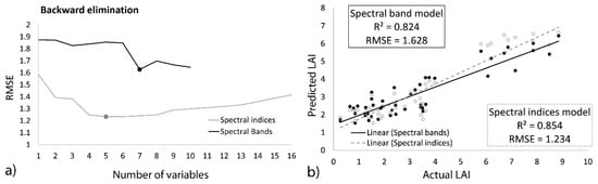 (a) The optimal predictive variable selection using the backward elimination process. (b) Relationships between the predictive and actual LAI values, using the best spectral bands and spectral indices model. Points represent measurements at the ESU level, dashed lines represent a 1:1 relationship.