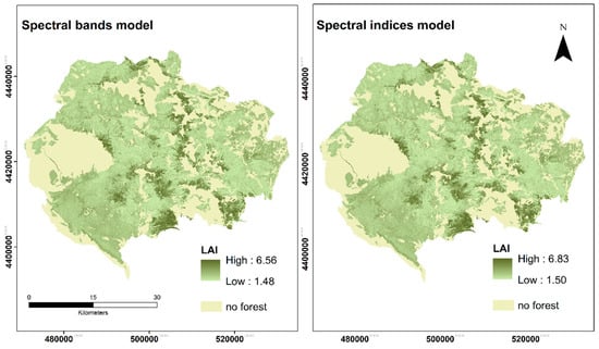 Leaf area index (LAI) maps based on Sentinel-2 (left) spectral bands and (right) spectral indices best prediction models.