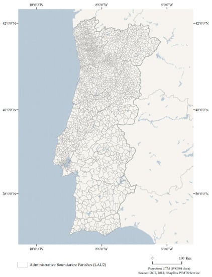 - INE—Instituto Nacional de Estatística. Administrative Division. Available online: https://www.ine.pt/xportal/xmain?xpid=INE&xpgid=ine_cont_inst&INST=6251038&xlang=pt (accessed on 3 September 2020).