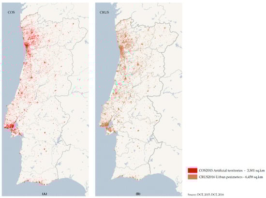 COS is a digital vector map product, available since 1990, where, through hierarchical nomenclature and using a minimum unit area of 1 ha, the land cover/land use is characterised diachronically in Mainland Portugal (CORINE Land Cover is a similar document []). The “Artificialized Territories” category is part of this nomenclature, which are “Artificialized or landscaped surfaces, intended for activities related to human societies. This class includes urban fabric areas, industrial areas, commercial areas, the road and rail network, service areas, gardens or urban parks and cultural and leisure equipment” []. Although the intent of this map is not to delimit urban areas, the category “Artificial Territories”, with certain restrictions and in combination with other criteria, could be an illustrative indicator of the territorial extent of the urban areas. For the present study, the Artificial territories class of the 2015 COS map [], inside the urban perimeters delimited by CRUS, were considered (Figure 4A). Thus, it is spatially and temporally comparable with the other information used, namely CRUS and TIPAU (referred to 2016 and 2014, respectively). According to this classification, 3501 sq.km can be considered urban area.