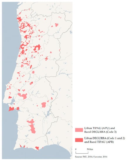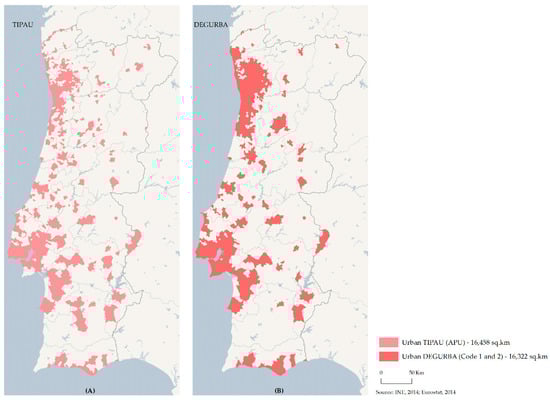 The administrative reorganisation (amalgamation/mergers []) of the Portuguese territory carried out by the Government in 2012, and the consequent administrative reorganisation of the territories of the parishes, resulted in a reduction of 1168 parishes from the total of 4050 existing before this process. Given this, Statistics Portugal needed to adapt TIPAU, which had been defined in 2009, to the new administrative map of the parishes of Mainland Portugal, resulting in TIPAU 2014. To this study, the “Predominantly urban areas” (APU) were considered as representative of the urban dimension (Figure 5A), and classifies as urban area 16,458 sq.km of the territory.