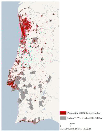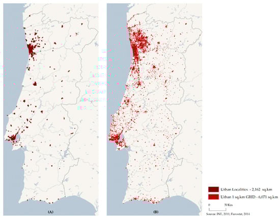 The 1 sq.km population grid is defined by EUROSTAT, within the GEOSTAT project, as “…a lattice composed of 1 sq.km grid cells overlaying a particular territory, for which information is collected relating to the number of inhabitants. (…) The grid is stable over time, not dependent on changes in administrative boundaries and may be used for spatial aggregations to various territories of interest” [] (p. 7). Figure 6B shows the grid cells that are considered urban using the threshold of 300 inhabitants per sq.km, according to EUROSTAT.