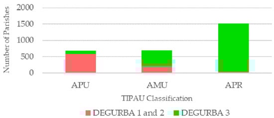 Number of parishes with different classification considering TIPAU 2014 and DEGURBA 2014.