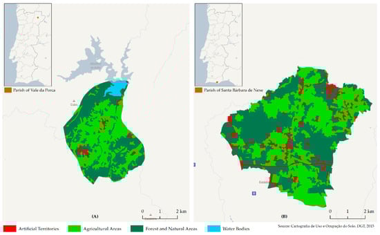 Land use in 2015 (A) Vale da Porca (TIPAU = APU and DEGURBA = 3); (B) Santa Barbara de Nexe (TIPAU = APR and DEGURBA = 1).