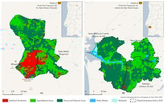 Land use in 2015 (A) União das Freguesias de Sé, Santa Maria e Meixedo; (B) União das Freguesias de Alcácer do Sal (Santa Maria do Castelo e Santiago) e Santa Susana.