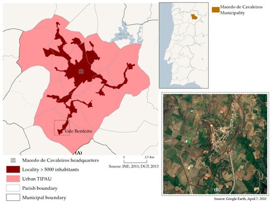(A) Macedo de Cavaleiros locality and the parishes of the municipality of Macedo de Cavaleiros classified as APU (TIPAU); (B) Aerial image of Vale Benfeito village.
