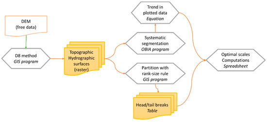Conventionally, ‘optimal’ scales in topographic and hydrographic mapping tasks are selected by intuition or experience. For example, Karydas and Panagos (2016) [5] combined a coarse and a fine scale of application within the framework of mapping sediment yield in Cyprus, in terms of an erosion model calibration. If determination of optimal scales were possible in advance of studying an environmental or land management problem, then the appropriate features or processes could be modelled in a rapid, correct, effective, and robust manner. As a paradigm, the introduction of functional scale by Jiang (2013) [6] in the problem of city mapping has led to the conceptualization of ‘natural cities’, as a bottom up, data-driven process, so that all mapped cities are comparable across different countries [7].