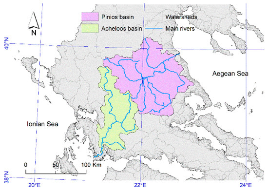 The two largest river basins in Greece, namely Pinios river basin and Acheloos river basin, located in the central-east and the central-west part of Greece, respectively, were selected to experiment with the new methodology. The Pinios river basin has a projected surface of about 10,701 km2 with a perimeter of about 888 km and pours out to the Aegean Sea (eastern coast of mainland Greece); the area is mostly plain covered by agricultural crops. The Acheloos river basin has a projected surface of about 5686 km2 with a perimeter of about 823 km and pours out to the Ionian Sea (western coast of mainland Greece); the area is covered mainly by forested mountains (Figure 3).