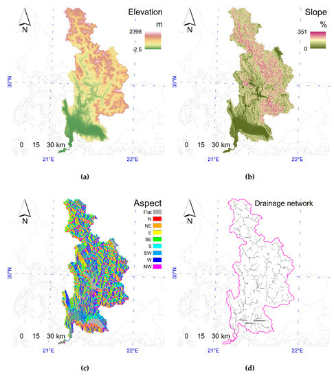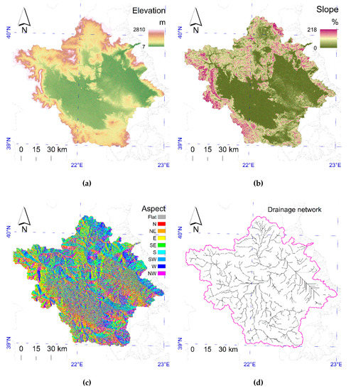 Topographic and hydrographic maps of the Pinios river basin: (a) elevation; (b) slope; (c) aspect; (d) drainage network (derived with flow accumulation thresholding (FAT) = 10,000).