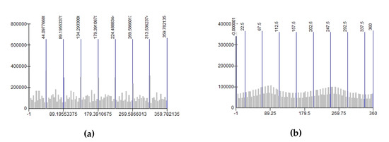 Frequency distribution plots of aspect values for the two studied river basins: (a) Pinios and (b) Acheloos.