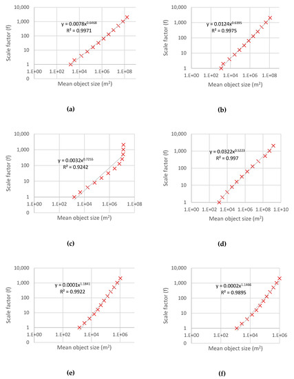 where f: scale factor; sf: the mean object size (at scale f (in m2); a, b: constants (a in m−2 and b dimensionless). Newman (2005) [29] argues that “power-law behavior may be identified empirically using already seen results”. Furthermore, Vuduc (1997) [30] states that fractal objects follow, by default, power-law statistical distributions of scaling.