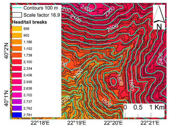 An indicative abstract from the segmentation results of Pinios elevation case; 100-m contour lines and the elevation values reclassified with the head/tail breaks are overlaid for comparison.