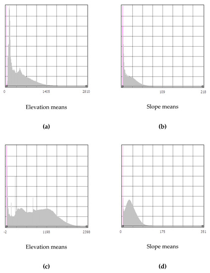 The topographic data distributions of the study: (a) Pinios elevation distribution (one small extra peak); (b) Pinios slope distribution; (c) Acheloos elevation distribution (two extra peaks); (d) Acheloos slope distribution (skewed normal distribution).