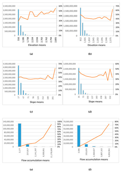 Head group extent (denoted by the columns; in m2) and percentage (denoted by the lines) vs. partition means for: (a) Pinios elevation; (b) Acheloos elevation; (c) Pinios slope; (d) Acheloos slope; (e) Pinios flow accumulation; (f) Acheloos flow accumulation.