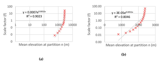 Nonetheless, regardless of the above abnormalities, the current results indicate clearly that the new method was successful in all cases. Moreover, plotting segmentation vs. partitioning data of any of the studied features shows that optimal scale factors could be computed directly from the mean values derived from the partitions. Indicatively, the two studied river basins resulted in the following equations for elevation (see also Figure 11):
