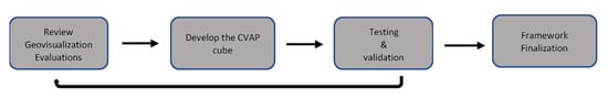 This research follows a two-stage process. First, a structured literature review was employed that examines the work related to the topics of visualization and geovisualization, climate adaptation strategies, and public and stakeholder engagement. Second, the literature review was then used to inform the qualitative development of a framework for classifying geovisualizations, referred to here as the Climate Visualizations for Adaptation Products (CVAP) framework. This translated into a 3D cube that provides a means for organizing visualizations along axes in terms of types, application, and intended audience for the tools, similar in its manner to MacEachren and Kraak [] and Bohman et al. []. Initial versions of the framework were created and subsequently tested by populating them with geovisualization products that were developed and examined in previous research. CVAP was refined after several iterations of this process by evaluating its effectiveness at representing the various considerations that go into selecting and using geovisualization tools. Figure 1 illustrates the workflow pipeline of the steps involved in this research, and these are described in further detail in the subsequent sections.