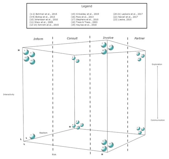 The design of the CVAP framework was informed by previous work on visualization concepts and best practices such as the amount interactivity available to a user [], the level of abstraction versus realism depicted [], communicating potential risk [], and the general objective of geovisualizations as tools that represent geographical information [,]. Populating the CVAP cube was achieved by reviewing literature that analyzed or evaluated existing geovisualizations. The geovisualizations that were included in CVAP are represented as spheres inside the dimensions of the cube. Each geovisualization product was analyzed, with special focus directed towards the amount of interactivity, risk, and realism associated with the geovisualization. They were then compared amongst themselves, and during this stage each visualization product was assigned a relative value of “Lower” or “Higher” based on the amount of interactivity, risk, and realism associated with the geovisualization. This was a relative comparison performed amongst only the geovisualizations included in CVAP. This process resulted in the formation of clusters which capture geovisualizations with similar qualities. Finally, the applicability of the cube was evaluated by examining whether the included geovisualization products fit into relevant categories based on the intended purpose they achieved and an appropriate type of audience for which the visualizations are suited. This stage indicated whether the chosen parameters for the model were indeed appropriately selected.