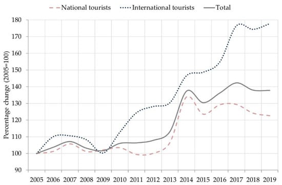Toledo is known as the city of the three cultures (Christian, Jewish and Muslim) and was declared a World Heritage Site by UNESCO in 1986 for its exceptional history, traditions and valuable monumental and architectural heritage. Every year for the last five years its singularity has attracted around 600,000 tourists staying overnight in hotels, 65% of which are Spaniards [77]. As can be seen in Figure 2, where the percentage change of tourists staying overnight in hotels (Base 100 = 2005), a registered important growth in the aftermath of the global financial crisis was detected, with a remarkable increase of up to 80% of international tourists. This international projection is explained by its central position in the Iberian Peninsula and its proximity to Madrid (less than 30 min by High-Speed Train and less than 1 h by road). Even above tourists, one-day visitors are the population segment with the greatest presence in the city. In fact, it is estimated that around 3 million visitors passed through Toledo in 2018 [78].