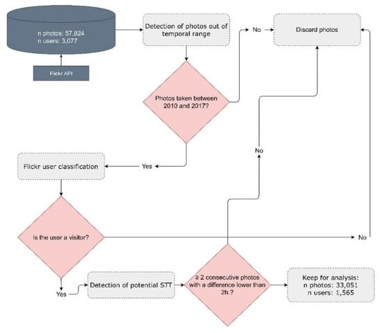 The data were uploaded into the R environment in order to clean and filter the dataset (see diagram flow presented in Figure 3). Out-of-date range photos were removed, since some photos uploaded in the reference period may have been taken prior to the defined temporal frame. A yearly exploratory analysis was carried out to identify whether the spatial patterns of the photos and users were different between years and the same patterns were found (see Figure A2 and Figure A3 in the Appendix A). In addition, a similar number of users per year was detected (see Table A1 in the Appendix A). Then, only geolocated photos suitable for extracting visitor travel trajectories were selected. In this regard, we established a criterion to determine whether photos were taken by one-day visitors, tourists or local inhabitants since their behaviour and routes within the city are expected to be different. To this end, three indicators were calculated that allowed us to classify users according to their use of the social network (see Table 1). They are based on the average number of months active per year in Toledo, the difference between the maximum and the minimum dates of the photos taken during the same month in the city, and the total number of years active in the city.