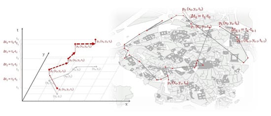 To detect potential spatiotemporal trajectories (STTs), each user’s photo collection was denoted as PuP, where all the photos pidPu were taken by the same user (up) and were chronologically sorted as a spatial and temporal sequence (see conceptual scheme in Figure 4). For each user, multiple STTs can be reconstructed, as they may have taken the photos at different times of the day or on different days.