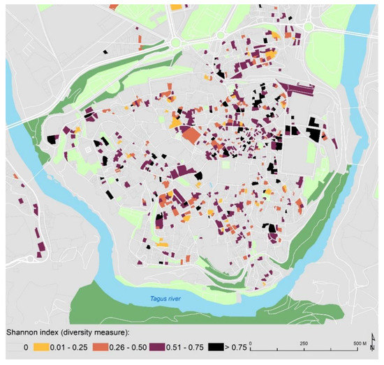 Figure 7. Shannon index (diversity) of the land uses in the historic centre of Toledo. Source: Authors’ own elaboration.
