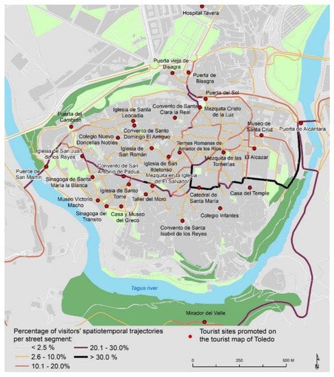 Finally, with the 1048 STTs reconstructed, a city flow map was a built and the tourist sites offered in the official tourist map of the historic centre of Toledo were classified according to the percentage of STTs that passed through the streets where they are located. In other words, with respect to the total number of STTs reconstructed, it was calculated the number of trajectories passing through the different streets of the heritage centre of Toledo, following this formula: