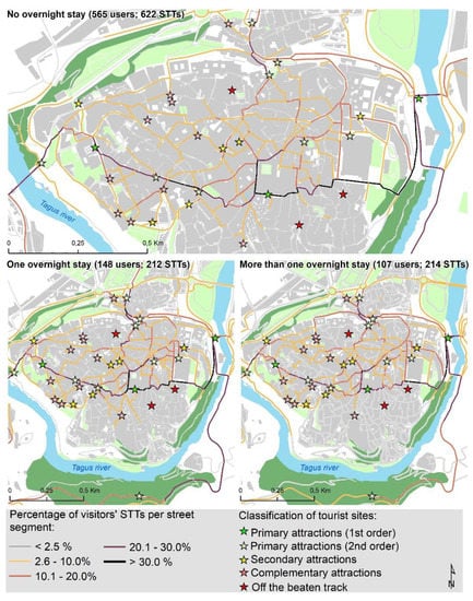 One of the major challenges in urban tourism management is created by the overcrowding of central spaces and specific street networks [18,19]. Visitor spatiotemporal behaviour involves movement and multi-attraction [20] and, consequently its analysis is critical for tackling the needs of the destinations correctly. Urban tourists tend to concentrate their movements in reduced areas within cities [21], where multiple kinds of tourist attractions are clustered. Moreover, the visitors’ time-restrictions at a destination and their interest in visiting/consuming as many sites of interest as possible make their behaviour a fast and intense experience [22]. It is in this framework that understanding visitors’ spatial behaviour can bring new knowledge about new flexible planning and management procedures and probably new visions about the built environment, its uses and its benefits [4].