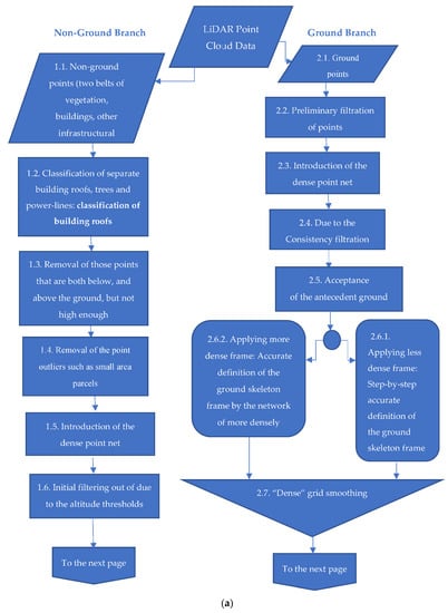 Approaches and methods that extract urban features and buildings in any alternative ways are of great interest, as it is very promising for various applications of 3D city models. The key range of these applications can, for instance, consist of urban planning, population estimation, urban disaster management, energy sector, planning of infrastructural networks, outlining different smart city projects, and solutions with 3D city models due to visibility analysis in urban environment. Automated feature extraction from the point clouds collected over urban areas is an extremely challenging task for its developers, surveyors, and other researchers, since it means 3D automatic mapping with a corresponding 3D scene generation, which should represent a space of the highest complexity. What is more, exactly LiDAR surveying technique has become for approximately three latest decades an efficient alternative data source for automated building detection, extraction and reconstruction with quite different methodologies and algorithms [,,]. Thus, the building and other man-made feature extraction from point clouds together with the relevant digital elevation model (DEM) generation is one of the most challenging research and development aims for proliferating urban studies as well as for support of making decisions for the urban environment by means of digitalization and information networks.