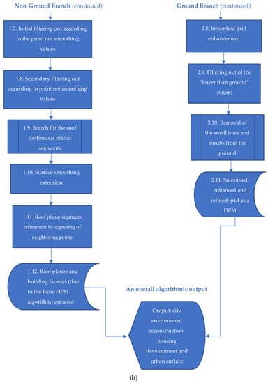 The Non-Ground branch, the left brunch of a two-branched algorithmic flowchart (Figure 1) can be also defined as the building extraction (BE) classifying branch due to a subject of its algorithmic content. The two-branched algorithm presented exposes key details of a point cloud classification as a fundamental basic of the high polyhedral modeling of buildings. Both branches, the ground and non-ground ones, belong to one logically united algorithmic workflow, and they are separated in the text exclusively for the better perception by a reader. That united workflow gives an opportunity to provide combined datasets of building models placed on a DEM of different scales as a final processed result obtained in a fully automated mode, while according to well-known references those CityGML models, that contain both terrain and buildings can hardly be overvalued [].