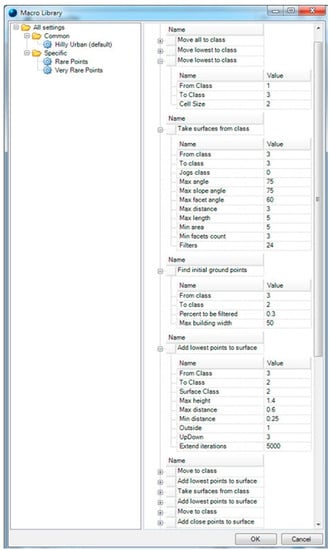 - Accurate Definition of the Ground Skeleton Frame by the Network of More Densely Located Points (block 2.6.2, the left sub-block of block 2.6):Following parameters for “2.2–2.6 ground” classifying algorithmic blocks should be entered for corresponding processing into the relevant Macro Library dialog (MLD) with further implementation in our desktop application ELiTCore—Figure 2.After the completed topographic skeleton-frame of the ground surface has been built as a continuous one on the point network of low density, this frame can be made to become even denser by applying the same method of a sliding window of 0.5 m × 0.5 m for making a network denser. The same algorithm, that has been applied in the third algorithmic block, is employed once again, if the point density value is acceptable for provision of this procedure. Since our accepted size of the sliding window as 2 m × 2 m contains 16 cells of 0.5 m × 0.5 m, a total number of algorithmic iterations is not too big in this case.