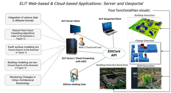 The ELiT (EOS Lidar Tool) is a Web-Based platform titled as ELiT Server (a landing page is available on https://eos.com/eos-lidar/), and a cloud-based application that applies to AWS instance resources—ELIT Geoportal (EGP). The latter is a type of web portal used to find, access, and process LiDAR geospatial information, both primary, and derivative one. This cloud platform also provides the associated geospatial services (summarizing, display, editing, analysis, etc.), widely using various. Web resources and options (http://ELiT-portal.eos.com/). The precursor software for these two sets of LiDAR data processing/displaying tools is the desktop ELiTCore software, to which, although only in terms of embedded MLD, we have already referred to above (Figure 2). This software has even to a certain extent broader functionality, but it can generate only the heavyweight polyhedral models within the HPM framework. The whole AFE-algorithmic pipeline explained above has been firstly implemented just in the ELiTCore package. The “building extraction” (BE) functionality based exclusively on the HPM algorithms has been developed for the standalone application for provision of detection, extraction, and reconstruction of heavyweight models according to general workflow of the classifying algorithm introduced in this text and due to the HPM AFE basic algorithm. It results in a topographic grid as a continuous feature generation exactly according to the Ground branch of the classifying algorithmic solution, and in a set of urban features which are the discontinuous objects, which are generated proceeding from the Non-Ground algorithmic branch (Figure 1).