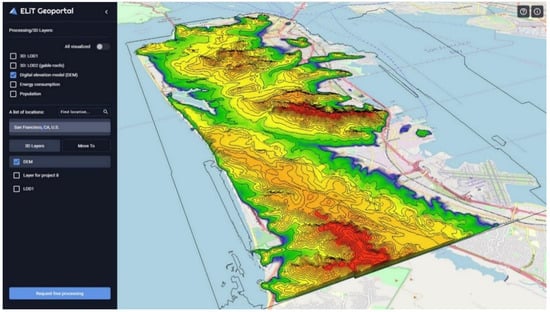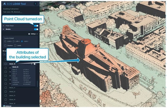 - The building extraction (BE) functionality (a sub-page Building Extraction in the Tools page of the Server) provides the high polyhedral modeling according to building detection, extraction, and its reconstruction through that algorithmic solution, which has been presented in detail in the previous section of this text. Finalized building modeling is primarily targeted to high-rise buildings frequently located in city downtowns. The BE-tool of ELiT Server provides generation of heavyweight models, consisting of numerous polyhedrons, which is why they may be described as “heavy ones”. Finalized visualization of these models is provided by the Cesium 3DTiles library with a certain level of detail (LOD), while a primary Lidar point cloud can be visualized too. As a rule, a BE-model mandatory possesses its spatial, geometric, and semantic attributes. Thus, massive urban environment of a city can be simulated as the heavyweight models with minor details (Figure 4).