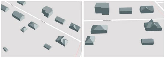 One more structuring of the automated feature extraction methods can be provided on the base of the building rooftop detection, segmentation and reconstruction []. Thus, the model-driven AFE for building roofs is provided, when either a predefined catalogue of roof templates-primitives does exist [,,] (e.g., it may be the CityGML rooftop catalogue []), or some formalized description for of the features to be extracted is provided, e.g., a determination of the parametrized shapes in a 3D space with 3D Hough transform methods []. Another interesting solution within the model-driven paradigm is referred to in [], where 3D models of prototypical roofs are based CityGML LOD2 templates, what has given an opportunity to perform through sparse point clouds [].