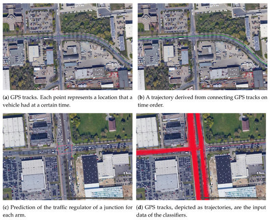 Images or GPS tracks are commonly used for regulator detection and classification [21]. Traffic-sign detection is a popular topic within the computer-vision community, with some studies focusing on the traffic-sign classification such as [22] and others on related topics such as the prediction of traffic-signal phases [23]. From a crowdsensing point of view, images generate a large amount of data that consume many resources, e.g., storage, bandwidth, energy and the consumption may affect the Quality-of-Service of applications that are built upon such data [24]. In addition, there are also privacy issues when individuals or number plates are recognizable in the images. Also, the GPS tracks work independent of occlusion, illumination or other situations deteriorating visibility. For these reasons, we opted to focus on light-weight data: GPS tracks instead of images. GPS tracks are time-ordered triplets {latitude, longitude and timestamp} as shown in Figure 1a, which are often connected in time sequence and stored as trajectories, as shown in Figure 1b. Schematically, the goal of predicting the traffic regulator of each arm in junctions from GPS tracks is depicted in Figure 1c,d.