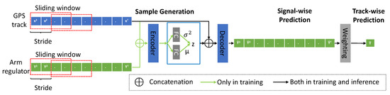 The CVAE model has two different information flows in training and inference/prediction, respectively. In the training process, both the GPS signals and the corresponding arm regulator are available. First, the label of the arm regulator is duplicated to align with the signal time steps. Then a sliding window is applied to exhaust the GPS signal and arm regulator sequences in parallel. After that both sequences are concatenated as a complete input for training a variational encoder for the latent variables. In the end, the decoder is trained by using the GPS track information and the latent variables for predicting the signal-wise arm regulators, which is later summarized by the weighting function for achieving the track-wise prediction. In the inference process, only the GPS signals are available. In order to predict the arm regulator, the GPS signals are concatenated with the latent variables directly sampled from the Gaussian distribution. We used Long Short-Term Memories (LSTMs) [43] for both the encoder and the decoder.