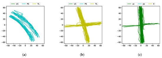 GPS tracks extracted from the given junction for traffic regulators such as priority-signs, traffic-lights and uncontrolled. (a) Priority-sign junction (PS). (b) Traffic-light junction (TL). (c) Uncontrolled junction (UC).