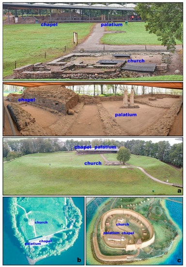 In order to conduct a questionnaire among experts and gamers, we have selected the residence of the Piast dynasty’s first rulers on a holm on Lake Lednica (Ostrów Lednicki) with perfectly preserved 10th century ruins of the palatium and the chapel of Duke Mieszko I (ca. 960–992) and his son, the first King of Poland, Bolesław “the Valiant” []. What was relevant to our research was the fact that the ramparts of the stronghold were well-marked in the landscape of the island. The stronghold was developing in several phases, however, we focused on the second half of the 10th century []. This state of the stronghold included the large palatial-ecclesiastical structure and the small church together, which were accompanied by wooden constructions of varying size. These two stone buildings have become the objects of our virtual reconstruction.