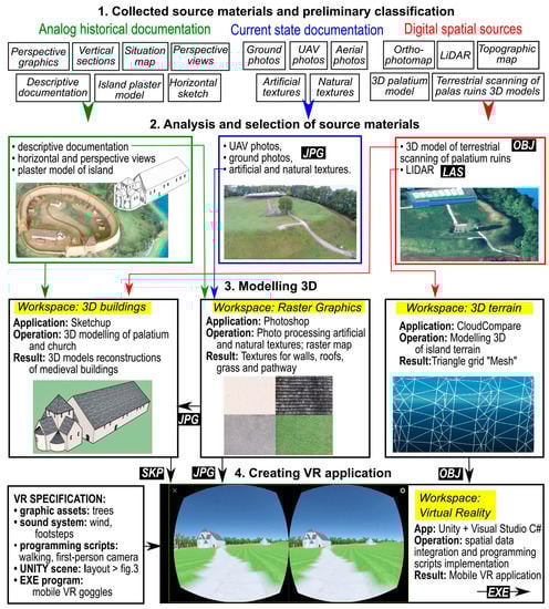 Historical objects, crucial for the country’s history, have been frequently non-existent for centuries, and various sources need to be used to reconstruct them [,]. Schematic perspective drawings of buildings, horizontal and vertical maps, as well as situational maps made by scientists to present the hypotheses of the original medieval state constitute significant sources of information. On the other hand, there are digital 3D models of the current state of ruins and traces in relief obtained from TLS (Terrestrial Laser Scanning) and UAV (Unmanned Aerial Vehicle) photos in the form of raw data []. The process of integration of all the materials obtained in order to create a VR application can be ordered according to data types and formats, adjusting them to be then processed in suitable programming workspace, which is, again, carried out according to the established order of technological work in several workspaces.