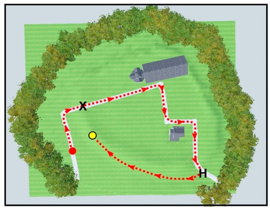 Figure 3. Layout of the virtual walk around the stronghold with the starting point (the red dot) and three viewing points (X, H, and the black dot).