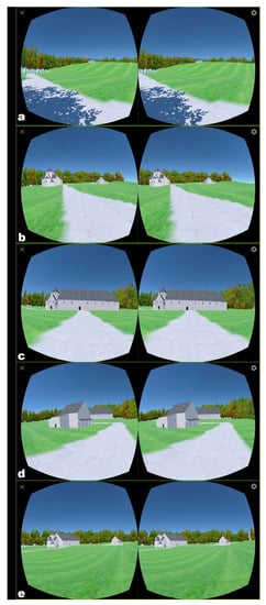 Figure 4. View in VR goggles during the virtual walk around the stronghold at the starting point (a), the first viewing point X (b), next to the palatium with the chapel (c), the second viewing point H (d), and from the last viewing point (e). - to prepare and conduct a survey among experts and gamers (Section 4.3, Figure 5),