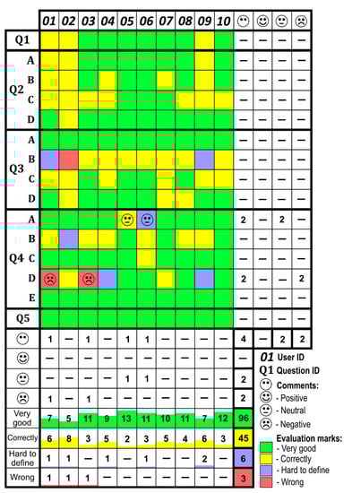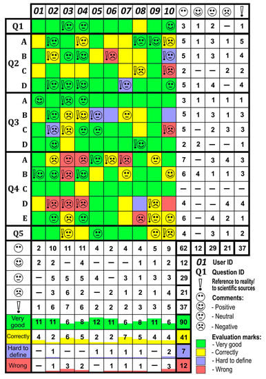 The answers and marks provided by respondents are then placed in analytical tables, charts and diagrams to demonstrate specific features. To facilitate the process of drawing conclusions and to reveal the relations between users’ evaluation, cartographic research employs forms of graphic enhancement, such as the use of color and other graphic variables, as well as graphically supported evaluation of mapping techniques in the form of advanced graphic forms [,,].