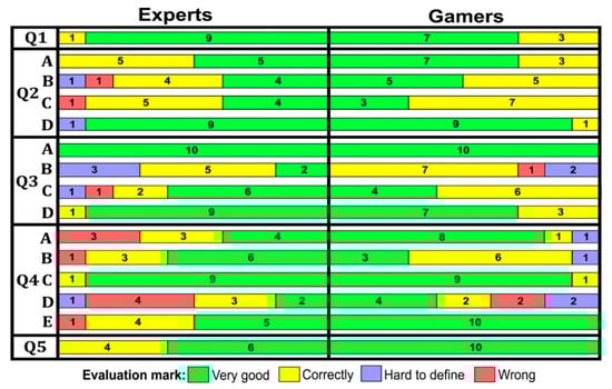 Comparing the way that the opinions were expressed by 10 experts and 10 gamers, one can draw a conclusion that the group of gamers is more homogenous as the same comments are made by most gamers on the same issues. On the other hand, a diverse combination of colors and faces in boxes denoting the same issues indicates individualized personalities of experts. All the respondents used mostly the “very good” or “correctly” evaluation, even though gamers used them slightly more often (94%) than experts (87%). Such high evaluation was generally connected with a positive attitude and interest in new technologies since no respondent had previously had the opportunity to become immersed in VR in goggles.