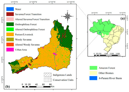 Ji-Paraná River Basin (JPRB): (a) location in Brazilian Amazon, and (b) land use/cover map.