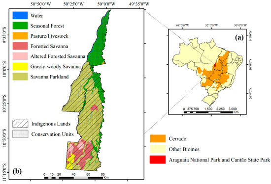 Araguaia National Park and Cantão State Park (ANP-CSP): (a) location in Brazilian Cerrado, and (b) land use/cover map.