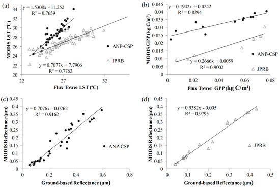 Validation using Large-Scale Biosphere-Atmosphere data for: (a) Land-Surface Temperature (LST) from the Moderate Resolution Imaging Spectroradiometer (MODIS) data, (b) Gross Primary Productivity (GPP) from the MODIS data, (c) MODIS reflectance in the Araguaia National Park and Cantão State Park (ANP-CSP), and (d) Ji-Paraná River Basin (JPRB).