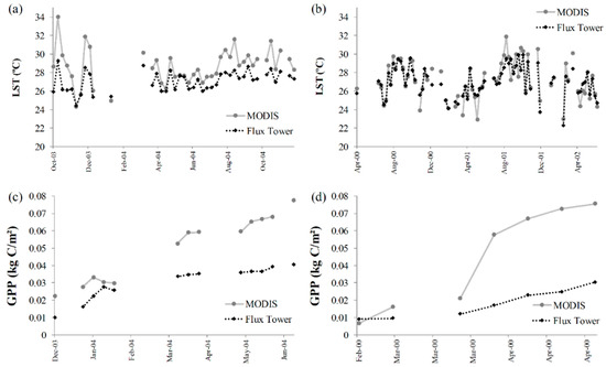 Comparison between MODIS data and flux towers of the Large-Scale Biosphere-Atmosphere project for (a) land-surface temperature (LST) in the Araguaia National Park and Cantão State Park (ANP-CSP), (b) LST in the Ji-Paraná River Basin (JPRB), (c) Gross Primary Productivity (GPP) in the ANP-CSP area, and (d) GPP in the JPRB area.