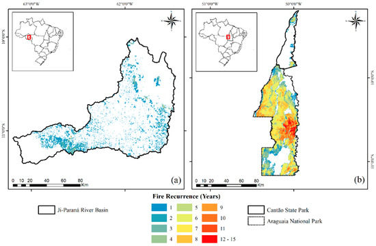 Fire Recurrence during the period 2001–2016 for: (a) Ji-Paraná River Basin, and (b) Araguaia National Park and Cantão State Park.